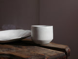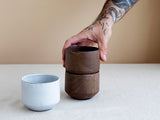 כוס קרמיקה בעבודת יד עשויה חימר שחור בזיגוג לבן מט עם צורה גלילית וקווים נקיים. הגימור המט והגוון העמוק מעניקים לכוס תחושה חמה ונעימה, והמבנה הפשוט יוצר כלי נוח לשימוש יומיומי