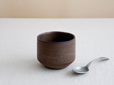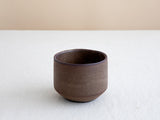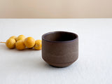 כוס קרמיקה בעבודת יד עשויה חימר שחור בזיגוג חום מט עם צורה גלילית וקווים נקיים. הגימור המט והגוון העמוק מעניקים לכוס תחושה חמה ונעימה, והמבנה הפשוט יוצר כלי נוח לשימוש יומיומי
